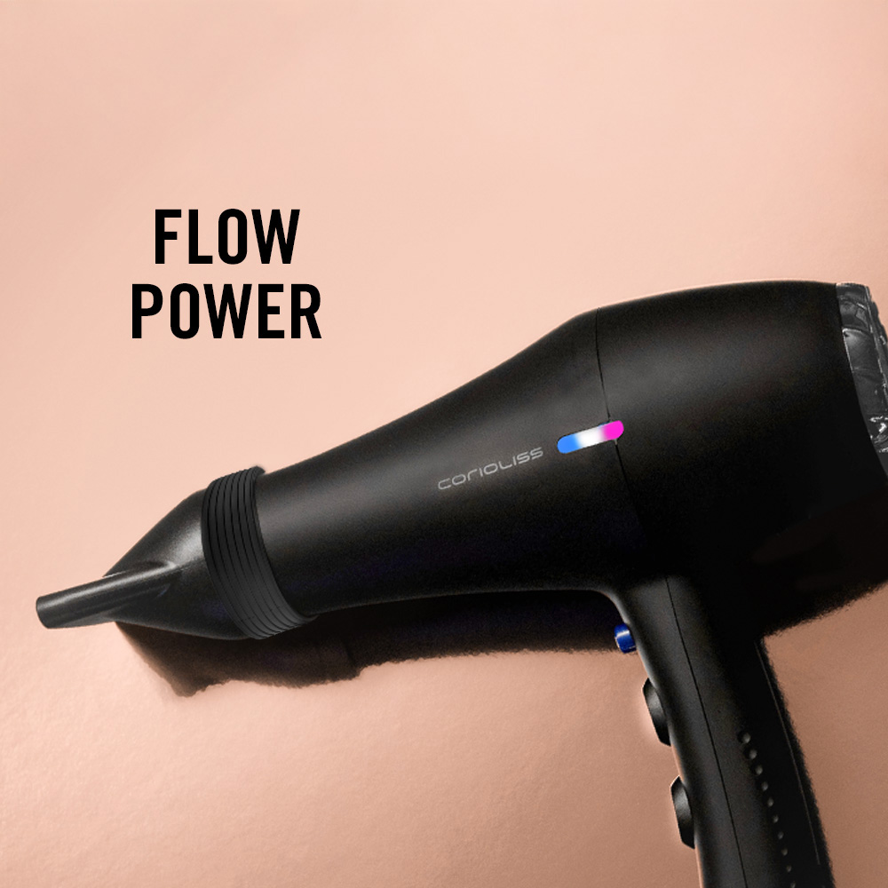 FLOW POWER BLACK CHROME Este secador cuenta con un potentísimo motor de 2200W, 3 selectores de temperatura y dos ajustes de velocidad. El botón de aire frío es perfecto para finalizar el estilo. Se incluyen 2 boquillas que proporcionan precisión y ayudan a un secado más rápido.