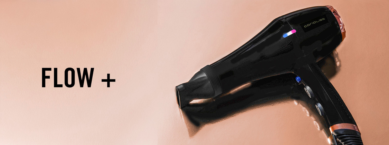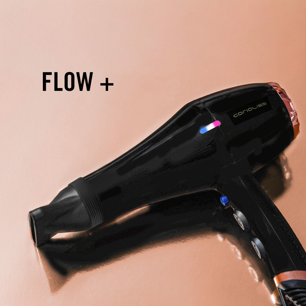 FLOW + Este secador Cuenta con un motor DC de 2000W, 3 ajustes de temperatura y 2 de velocidad. Incluye dos boquillas para aumentar la precisión en el peinado y su cable es de 3 metros, perfecto para utilizar en el salón.