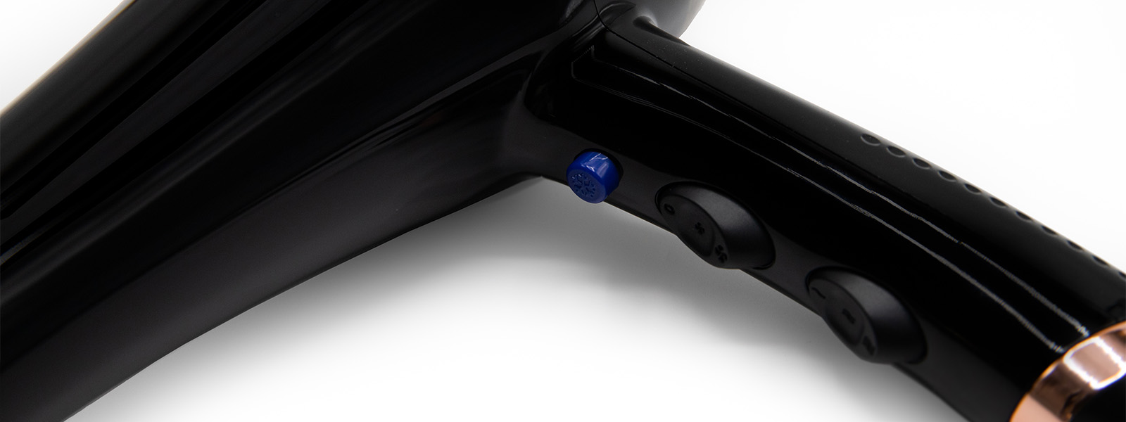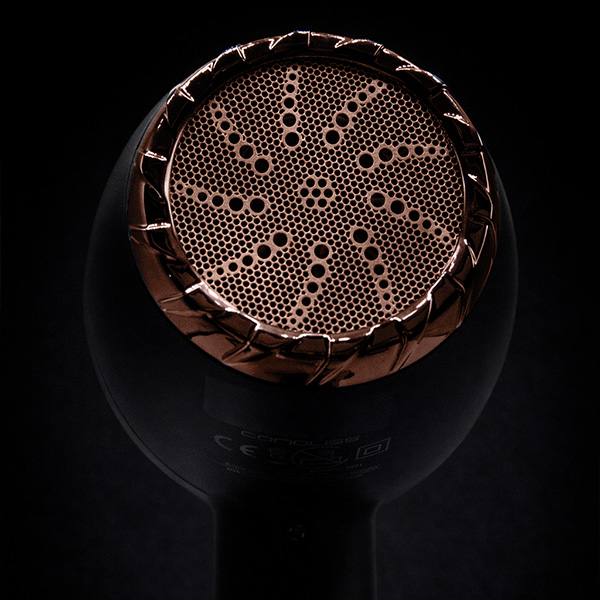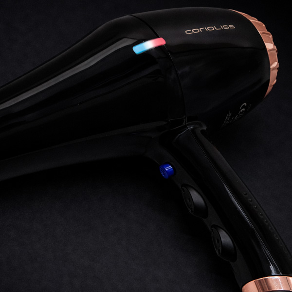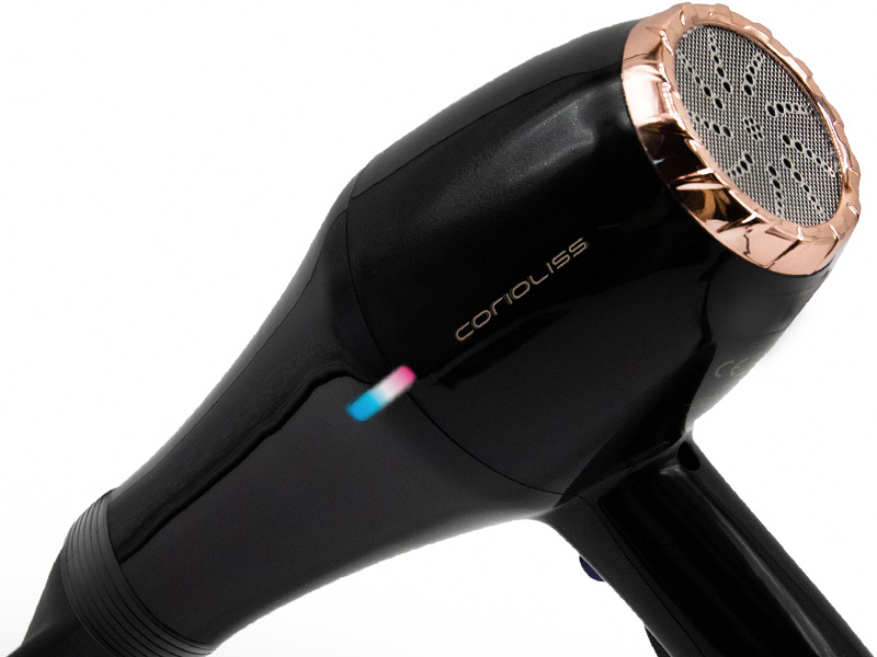 Su indicador LED muestra la temperatura de trabajo, variando desde el azul para el ON/aire frío, hasta el rosa para aire caliente.