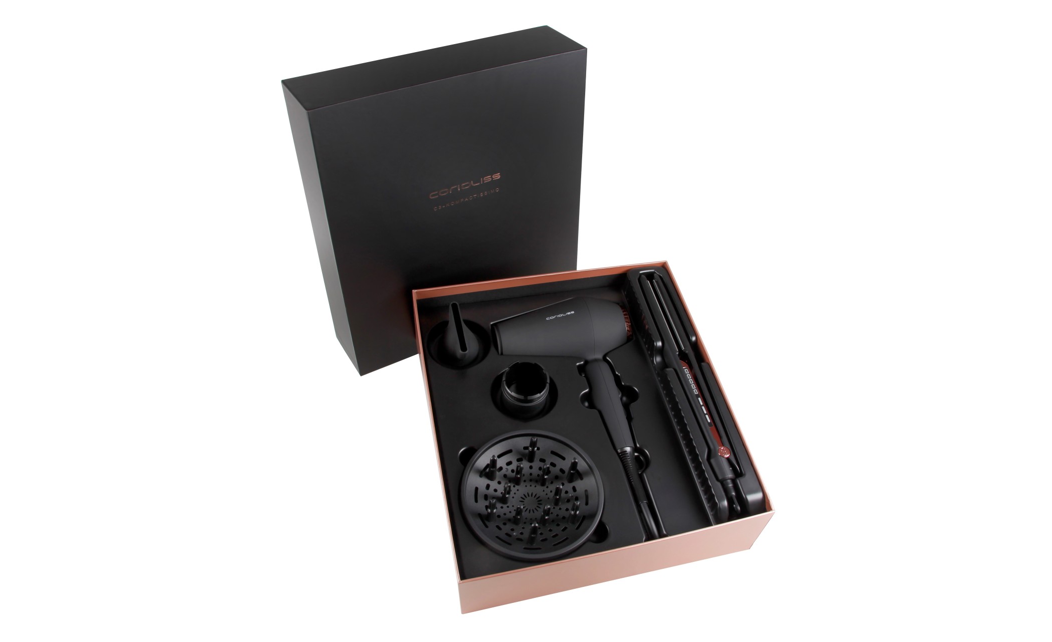 Te presentamos la exclusiva edición limitada creada Black Copper, diseñada para transformar tu rutina de cuidado capilar. Excelencia, diseño y máxima eficiencia, ofreciéndote resultados profesionales sin salir de casa, que incluye la plancha C3 y el nuevo secador profesional Kompactissimo.