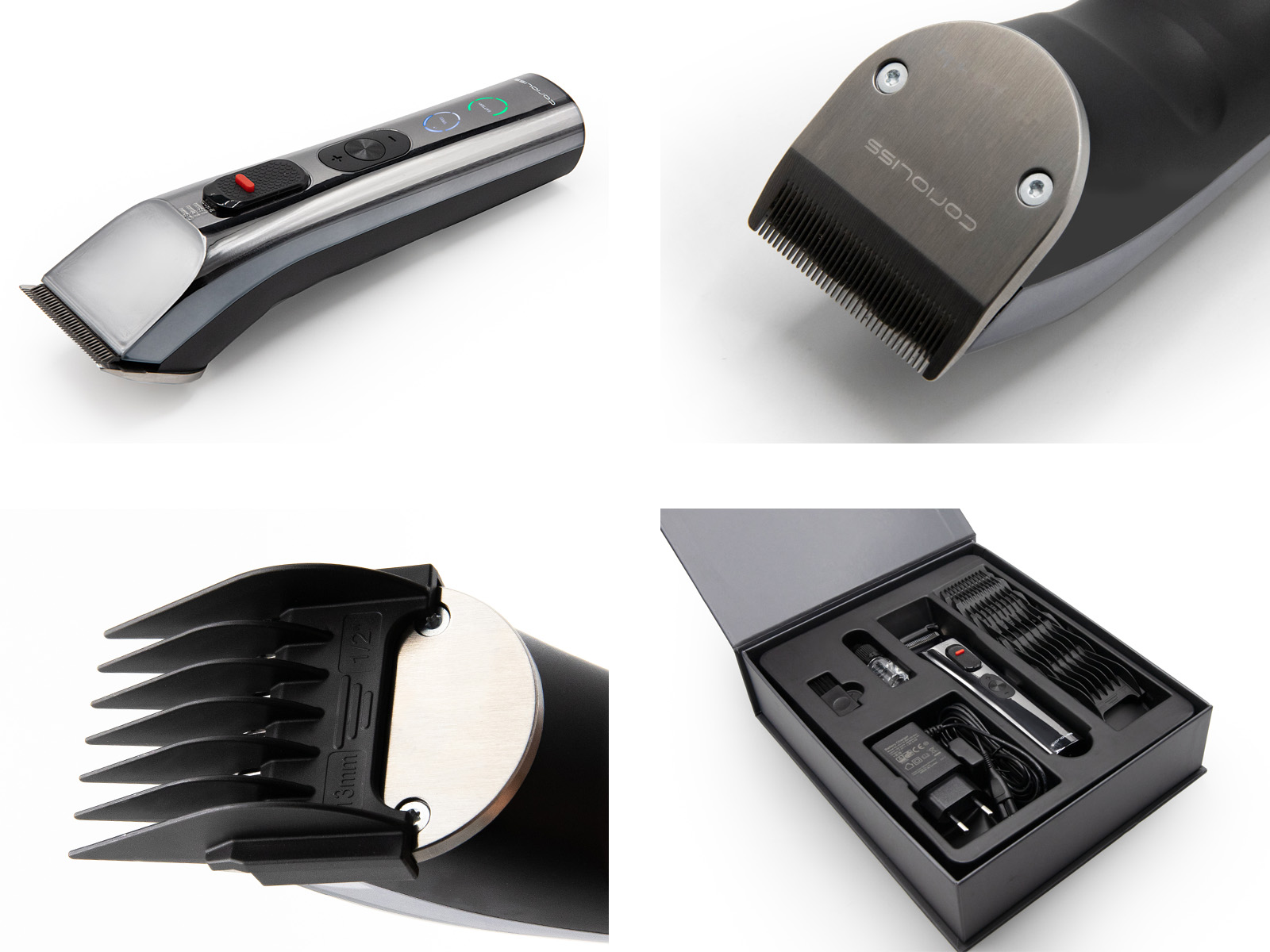 Juego de peines de corte premium en una gama de tamaños: 1,5 mm, 3 mm, 4,5 mm, 6 mm, 10 mm, 13 mm, 16 mm, 19 mm, 22 mm y 25 mm.